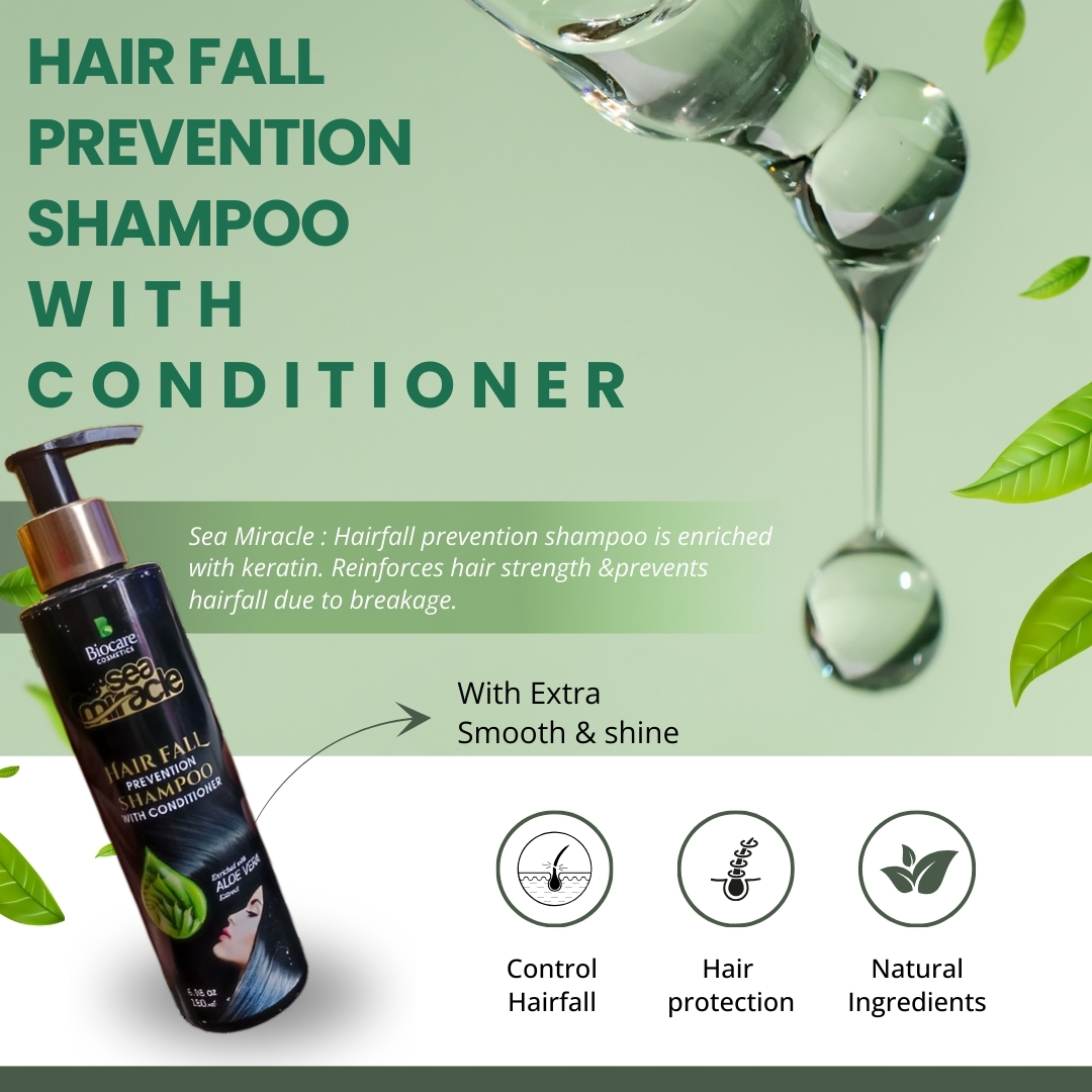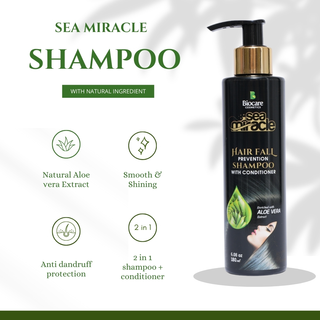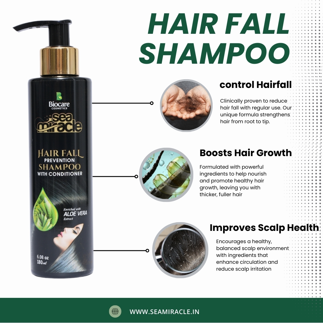 Sea Miracle Hair Fall Prevention Shampoo with Conditioner is a powerful 2-in-1 formula designed to cleanse, nourish, and strengthen hair from root to tip. Enriched with Aloe Vera extract, it helps reduce hair fall, improve scalp health, and restore natural shine and softness.